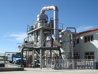 After the material liquid is heated to the boiling point in the heater tube, part of the water vaporizes, so that the heat energy is converted into kinetic energy of upward movement; At the same time due to the heating pipe vapor liquid mixture and circulating pipe not boiling between the material produced between the heavy difference, in the expansion kinetic energy and the heavy difference induced by the natural circulation of the material liquid (the material liquid in the heating pipe circulation speed is less than 1m/s), the more heat the material liquid, the better the boiling, the circulation speed will be larger. Due to evaporation under the action of vacuum, the evaporation temperature of the material liquid can be controlled below 50℃ to some extent. The secondary steam from the evaporation is captured by the screen defromer and liquid trap, and is condensed by the water jet pump. After centrifugal rotation, the material liquid in the evaporation tank returns to the lower part of the heater along the outer circulation pipe for recircular heating and evaporation, so the circulation heating and evaporation (about 15-20 minutes), when the required concentration is reached, the continuous discharge begins, and the continuous feeding at the same time, thus forming a continuous vacuum concentration operation.