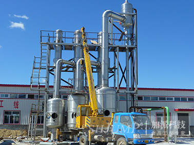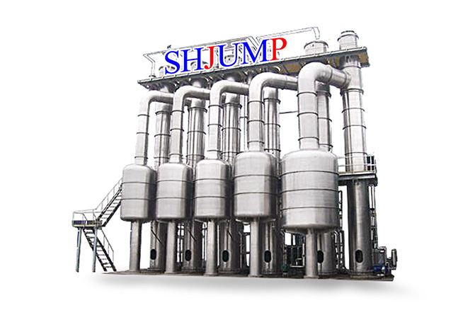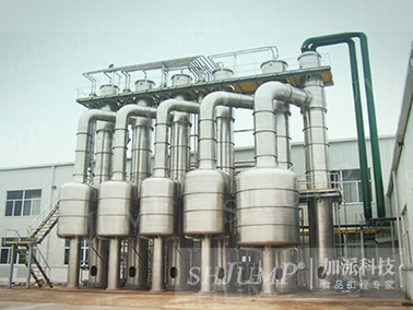 In falling film evaporation, the material is fed from the passage in the heating chamber and distributed evenly into the heat exchange tube after distribution and film forming device. Under the action of gravity, vacuum induction and airflow, the material forms a uniform film and flows down from the top. During the flow, the material is heated and vaporized by the heating medium in the housing. The released steam and liquid phase will enter the evaporator's separation chamber to completely separate the steam and liquid. The steam enters the condenser for condensation (single operation) or enters the next stage of the evaporator as a heating medium, thus achieving multistage operation and separating the liquid phase discharged from the chamber.