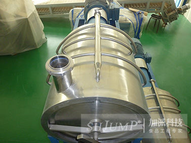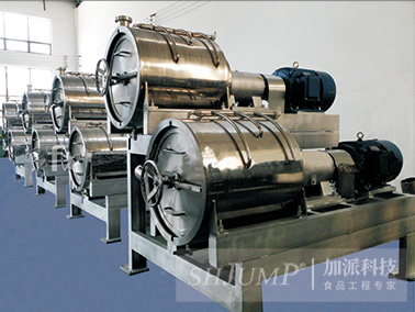 The motor drives through the belt, so that the scraper installed on the spline shaft rotates at high speed. When the broken fruit enters the machine through the feeding port, the pulp plate evenly distributes the material to the scraper and screen.  Due to the rotary action of the scraper and the existence of the lead Angle, so that the material along the cylinder to the export end of the movement, the trajectory of the movement is spiral, the material is in the process of moving between the scraper and the sieve tube by centrifugal force and be scraped, juice and meat (has become pulp) from the sieve hole through the next process into,  (double beater for linkage repeat the above process) the skin and seeds are discharged from the slag hopper, in order to achieve the purpose of automatic separation.  As long as the change of different specifications of the screen and adjust the size of the lead Angle of the scraper, different beating speed can be changed to obtain satisfactory results.