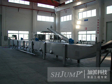 水浴式殺菌機(jī)主要應(yīng)用于果蔬的殺青處理。設(shè)備雙層網(wǎng)帶設(shè)置,有效的將燙漂的蔬菜完全壓制在熱水中,讓蔬菜能夠漂燙均勻。網(wǎng)帶的速度勻速可調(diào)。設(shè)備配有氣動(dòng)角座閥漂燙池內(nèi)的溫度降低時(shí)會(huì)自動(dòng)補(bǔ)入蒸汽。漂燙池內(nèi)溫度達(dá)到設(shè)定溫度時(shí)自動(dòng)關(guān)閉以節(jié)能。設(shè)備適用于水果和蔬菜的預(yù)煮工藝,具有溫控性好、效率高、節(jié)省人工等特點(diǎn)。設(shè)備抑酶護(hù)色并及時(shí)脫水冷卻,使果蔬保持原有的自然色澤。