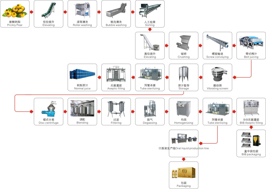 以刺梨為原料,通過選果清洗、破碎、榨汁、分離、滅酶、調(diào)配、澄清、脫氣、殺菌、灌裝等多道工序,最后獲得刺梨果汁及系列產(chǎn)品。
