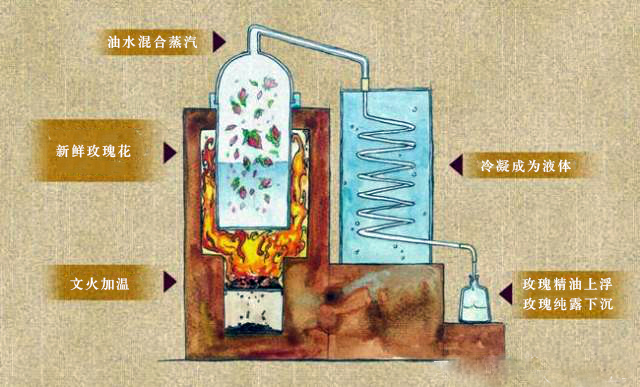 玫瑰花與水按14投入蒸鍋內(nèi),先用間接蒸氣加熱。溫度上升到70-80C時,通入直按蒸氣加熱到沸騰,約用30-40分鐘,維續(xù)蒸餾2.5-3小時,控制流出液是為花重的1-2倍,蒸餾速度為蒸誤容積的8-10%控制冷卻水量,使流出液頭半小時溫度控制在28-35℃,半小時后*度控制在40-45℃,一般不超過50C。流出液經(jīng)油水 K 分離器將玫瑰油與玫瑰油飽和蒸餡水分開,取出玫瑰油,飽和蒸餾水由油水分高器在高差作用下流入復(fù)榴柱,在蒸鍋上升的蒸氣的作用下進行加熱復(fù)餾,再經(jīng)冷凝器回到油水分離器,這樣反復(fù)蒸餾、復(fù)餾技術(shù)要點
