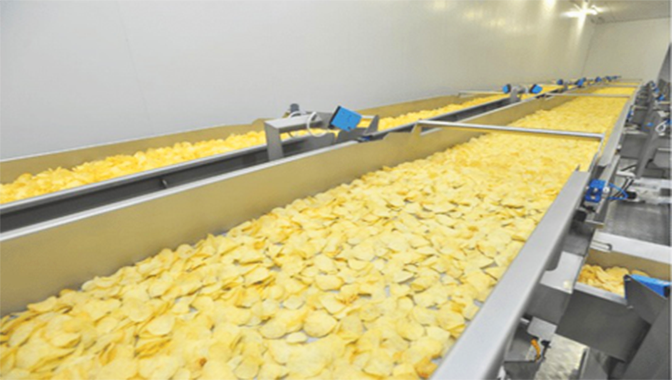 After cleaning the potato chips are sent to the blanching machine for blanching, from the cleaning and blanching out of the potato chips carrying a large number of attached bars and water. Using a strong wind shaker, separate the individual chips and blow dry the attached water. It is then sent to the deep-fry machine, which reduces the water content of the chips from 80% to 2%, resulting in a crisp product. The oil content in the finished product of fried crisp is between 30% and 40%. After frying, the chips are transported to a drain conveyor belt to drain any remaining oil on the surface of the product. The fried chips are transferred to a drum seasoning machine for seasoning, adding different seasonings according to the product. The seasoned chips are then transported to the packaging workshop, where the product is packed into the desired size and shape.