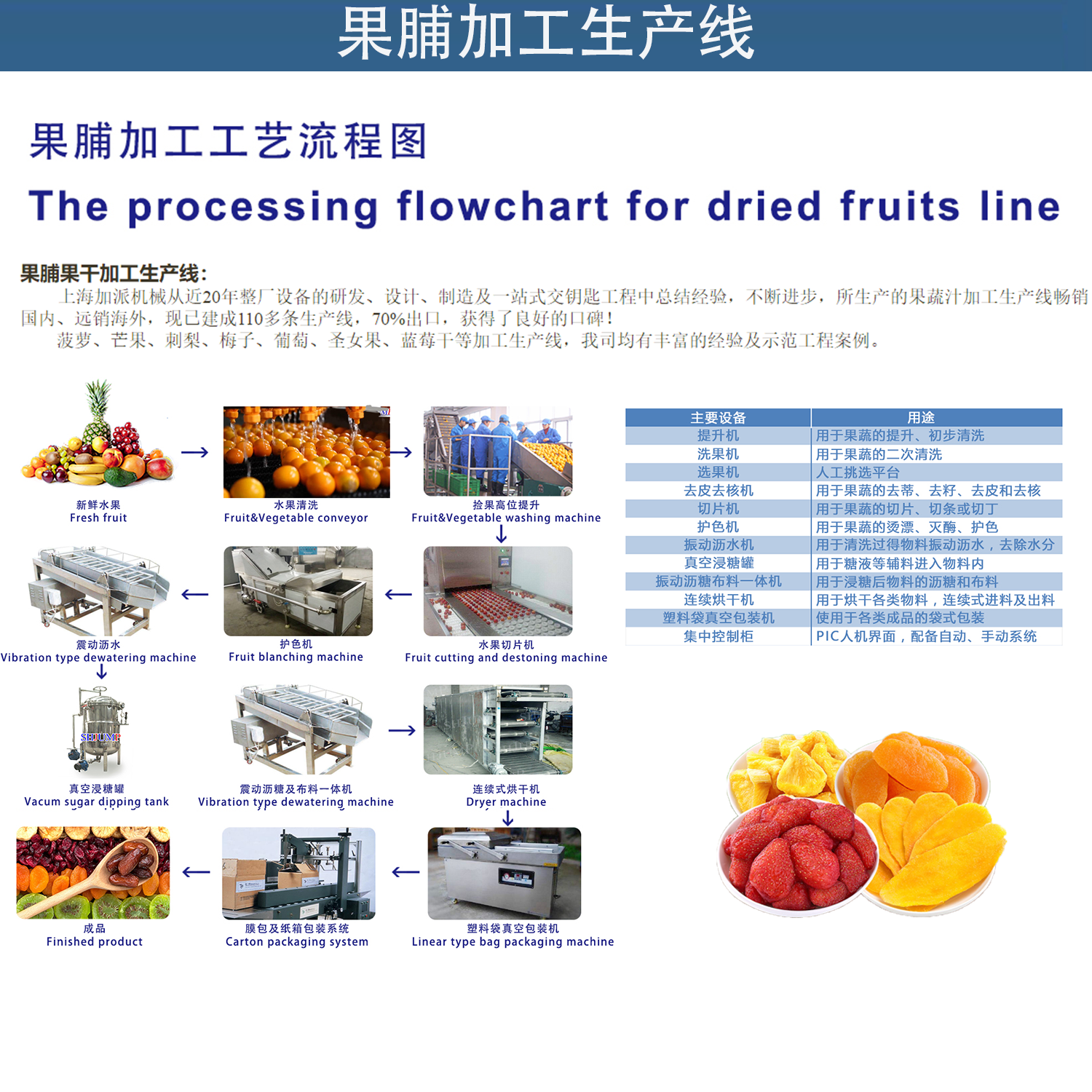 上海加派機(jī)械從近40年整廠設(shè)備的研發(fā)、設(shè)計(jì)、制造及一站式交鑰匙工程中總結(jié)經(jīng)驗(yàn),不斷進(jìn)步,所生產(chǎn)的果蔬加工設(shè)備暢銷國(guó)內(nèi)、遠(yuǎn)銷海外,現(xiàn)已建成300多條生產(chǎn)線,70%出口,獲得了良好的口碑!上海加派機(jī)械的果干果脯生產(chǎn)線主要由清洗、輸送、去皮去核、切片、護(hù)色、瀝水、浸糖、烘干、包裝等設(shè)備組成。本生產(chǎn)線設(shè)計(jì)理念先進(jìn),自動(dòng)化程度高,系統(tǒng)與物料接觸部分全為SUS304不銹鋼材質(zhì),完全符合食品衛(wèi)生安全要求。