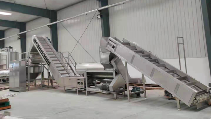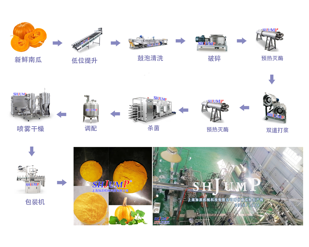 加派機械的南瓜粉生產線包含果蔬前處理系統(tǒng)、殺菌系統(tǒng)、無菌罐裝系統(tǒng)、噴粉系統(tǒng)、酶解系統(tǒng)、CIP清洗系統(tǒng)等,整線自動化程度高,系統(tǒng)物料接觸部分全為304不銹鋼材質,完全符合食品衛(wèi)生安全要求。