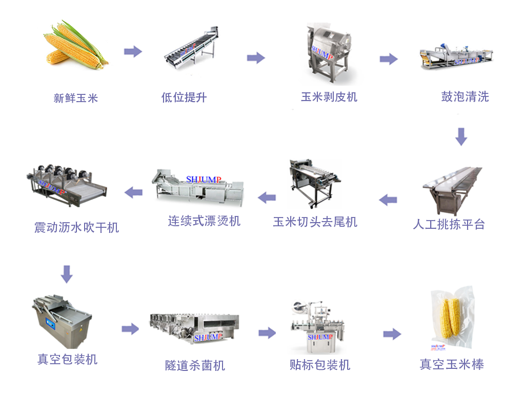 真空玉米棒,這是一種真空包裝高溫滅菌常溫貯藏的方法,貯存期可達(dá)一年。基本工藝流程:原料→去苞衣除須→挑選→水煮→冷卻瀝干→真空包裝→殺菌消毒→常溫貯存。首先將鮮玉米穗去苞衣除須,選擇無(wú)蟲口果穗在沸水中煮8分鐘,撈出冷卻瀝干水分,單穗真空包裝(真空包裝機(jī))。然后高溫高壓滅菌。滅菌消毒可采用巴氏消毒法,即用蒸鍋蒸半小時(shí),隔2天后再蒸半小時(shí);也可采用壓力蒸汽滅菌消毒法,溫度125℃,壓力0.14Mpa,10分鐘。消毒完成后,檢查包裝有無(wú)破漏。將完好無(wú)損的包裝裝箱常溫貯藏。食用時(shí)也需開水煮10-15分鐘。