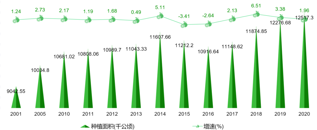 改革開放以來,在國家農(nóng)業(yè)優(yōu)扶政策支持、科技進步以及市場經(jīng)濟發(fā)展的背景下,中國水果產(chǎn)業(yè)迅猛發(fā)展。2005年開始,中國水果種植面積超過1000萬公頃,2019年開始超過1200萬公頃。