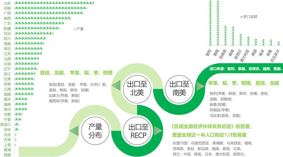 圖表2:中國水果主產(chǎn)地、出口銷往地、進口來源地分布情況