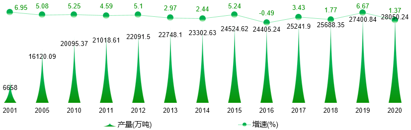 隨著種植面積的增加,以及單產(chǎn)水平的提升,中國水果產(chǎn)量也整體呈正增長態(tài)勢。2016年,受水果種植面積下降2.64%的影響,中國水果產(chǎn)量也減少了0.49%;隨后的2017~2020年,中國水果產(chǎn)量呈持續(xù)正增長態(tài)勢。