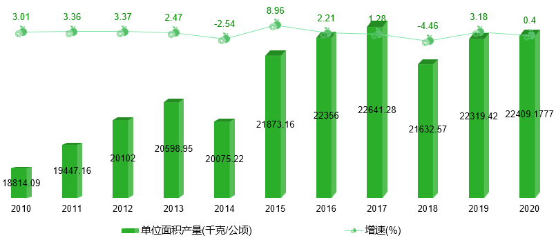 2010~2015年,中國水果單位面積產(chǎn)量增長較快,從18814.09千克/公頃(約1254.27千克/畝)增加到21873.16千克/公頃(約1458.21千克/畝),僅在2014年有過2.54%的下跌;2016~2020年,峰值為2017年的22641.28千克/公頃(約1509.42千克/畝),僅在2018年有過4.46%的下跌,整體在22噸/公頃(約1.5噸/畝)左右波動。
