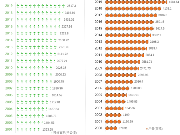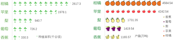 2019年,中國水果種植總面積為12276.68千公頃,總產(chǎn)量為27400.84萬噸。無論從面積還是產(chǎn)量排名來看,都是:柑橘>蘋果>梨>葡萄>香蕉。