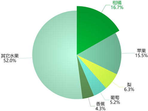 中國是全球水果生產(chǎn)與消費大國。從品類結(jié)構(gòu)來看,目前全國大宗水果種植以柑橘(21.3%)、蘋果(16.1%)、梨(7.7%)、葡萄(5.9%)、香蕉(2.7%)為主占總種植面積的53.7%;消費以蘋果、香蕉、梨、葡萄、柑橘為主;進口以榴蓮、櫻桃、香蕉、山竹、葡萄為主;出口以蘋果、葡萄、柑橘(包括橘子、葡萄柚、檸檬和酸橙)、梨、桃(包括鮮桃和油桃)為主。