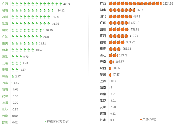 柑橘:面積↑產(chǎn)量↑,分布以廣西為主,尤以桂林較多