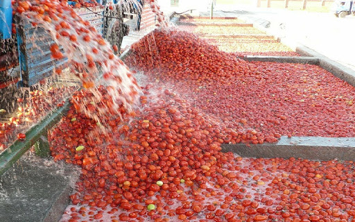 新鮮的番茄由工人倒進(jìn)流糟,番茄隨水送至浮選機(jī)做好挑選和清洗,隨后由輸送皮帶送進(jìn)“去籽機(jī)”做好粉碎,去籽。去籽后的醬液注入貯醬桶,再由螺桿泵輸送到預(yù)熱器做好加溫(溫度控制在七十℃上下),再在“打醬機(jī)”中粉碎成醬狀,除皮去渣,隨后被吸進(jìn)雙效真空蒸發(fā)器的二效蒸發(fā)室,其流入量由浮球式液位計控制。醬液在二效蒸發(fā)室、連通管和二效加熱器之間作自然循環(huán),一部分則與一效蒸發(fā)室出入口管的醬液混合(流出量由二效浮球式液位計控制)后經(jīng)循環(huán)泵送至一效加熱器,由0.2Kg/cm2(表壓)的蒸汽加溫后送至一效蒸發(fā)室,再一次蒸發(fā)濃縮,當(dāng)濃度值達(dá)到規(guī)定時,由濃度值控制器指引出醬閥開啟,醬液注入貯醬桶。而桶內(nèi)醬液由螺桿泵運輸至殺菌器(加溫至九十℃上下),末尾送至裝缸機(jī)裝缸。蒸發(fā)濃縮操作系統(tǒng)的真空值是由冷凝器、水環(huán)式真空泵等構(gòu)成,一效與二效蒸發(fā)室的壓力差是根據(jù)調(diào)整連通管道的阻力(即更改閥的開度)來實現(xiàn)的。常壓濃縮即原材料在張口的夾層鍋中,用6Kg/Cm2高壓熱蒸汽,使在二十分鐘~40分鐘內(nèi)實現(xiàn)濃縮實際操作。減壓濃縮是在雙效真空環(huán)境濃縮鍋中,1.5~2.0Kg/Cm2的熱蒸氣加溫下,原材料處于六百mm~七百mm真空環(huán)境狀態(tài)下濃縮,原材料所受到的溫度為50℃~60℃,商品的光澤度和口味均好番茄醬的濃縮終點站,用折光儀來明確,當(dāng)測出商品濃度值較規(guī)定規(guī)范高于0.5%~1.0%時才能夠進(jìn)行制品包裝。